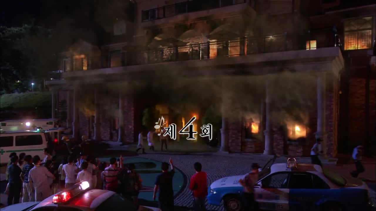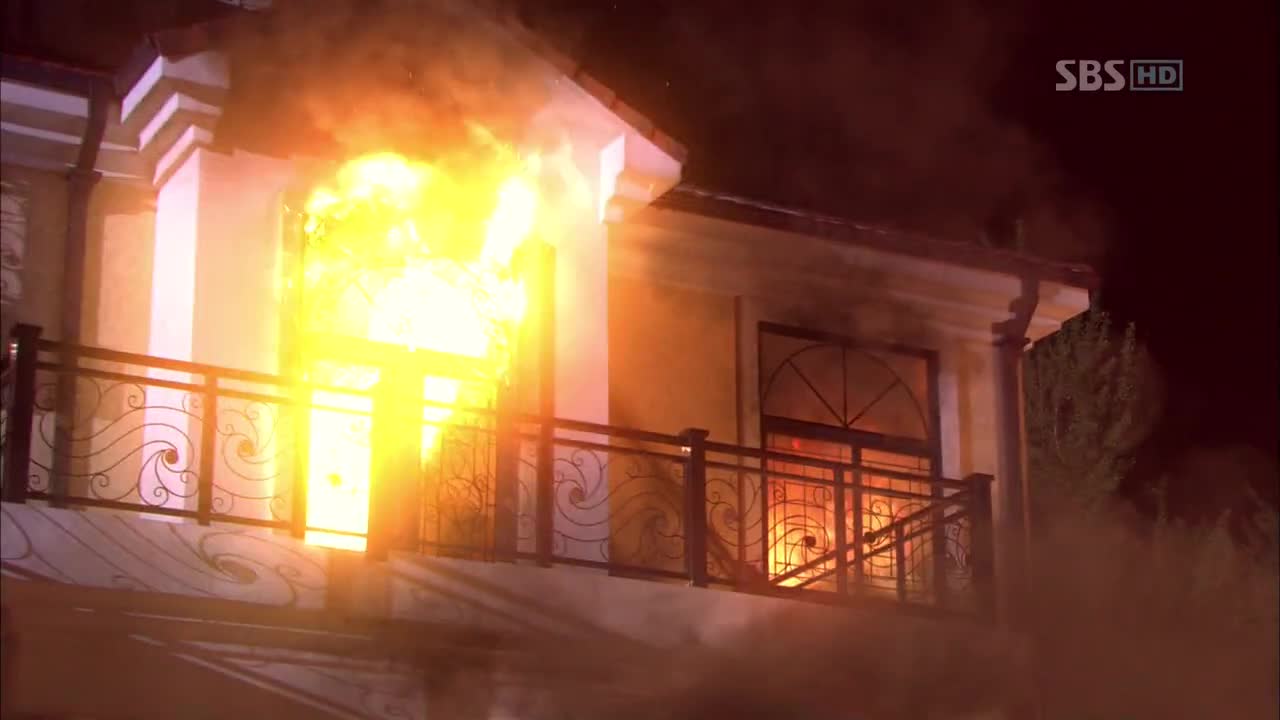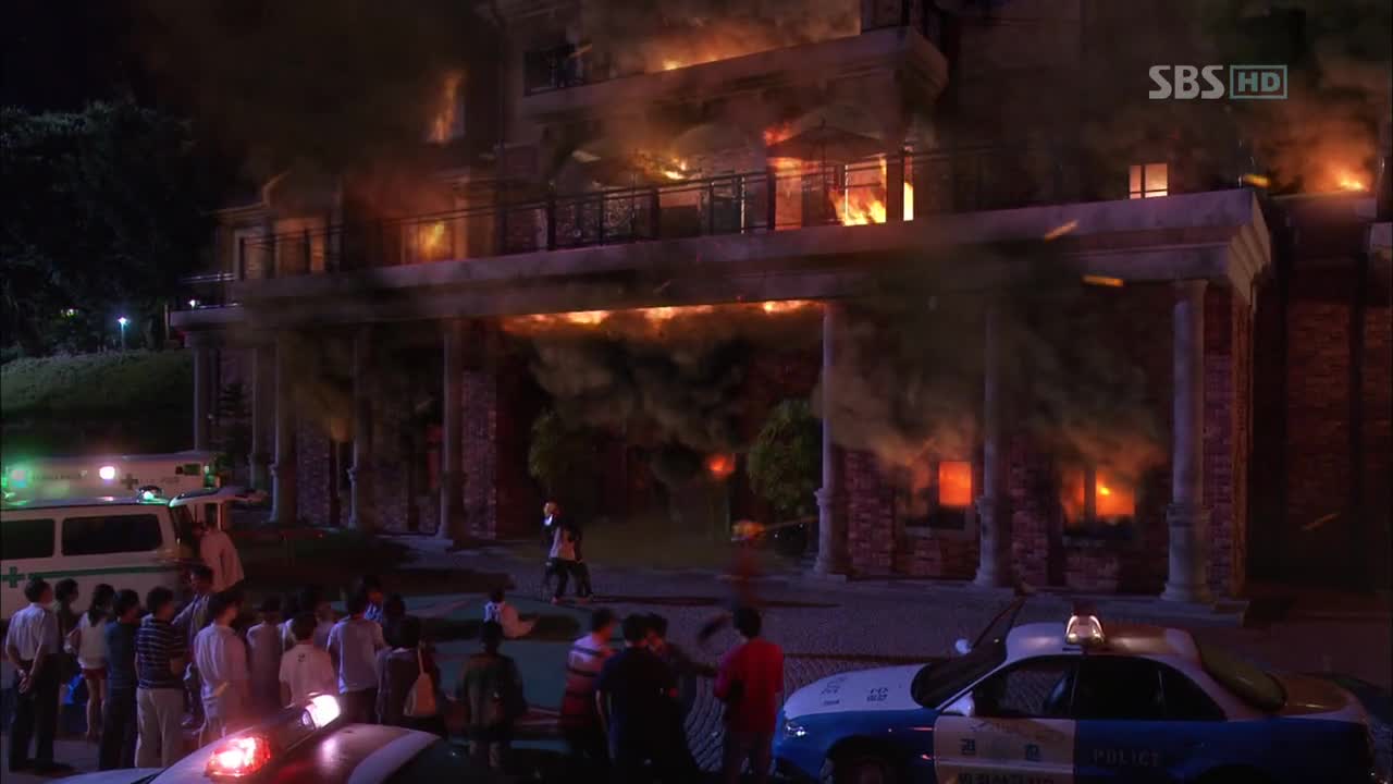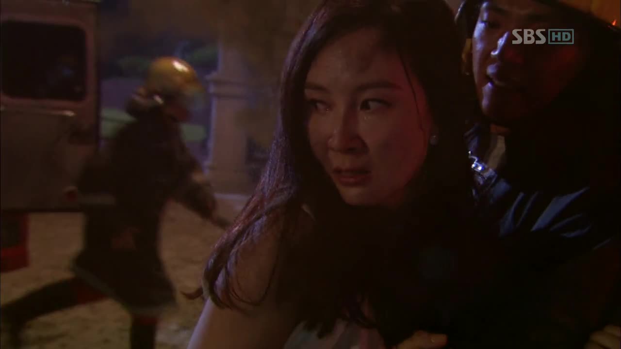 She hysterically runs back towards the house (again) and is stopped (again) by the firefighters, screaming at the front door for In-ha not to die (again) (and busting up her vocal chords in the process), just as the rest of the building explodes with pieces of McMansion flying all over the place.