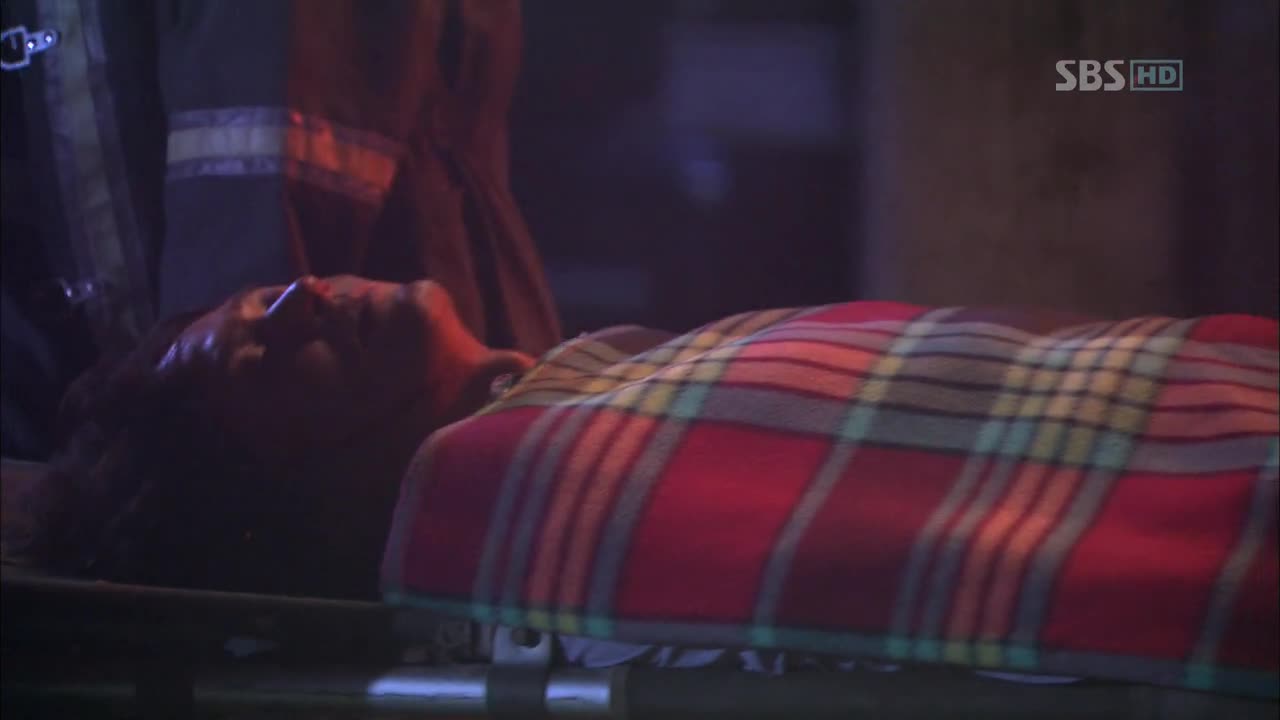 Meanwhile, in Oblivious Land, the Hong Family is sitting down to dinner. Da-mi asks her mom why she looks so pretty today; is it a special occasion? Nam-joo says nah, that she just wants to look good for her father today. Da-mi sees the gifted ring on the table, Da-mi wonders why their dad is so late tonight, ’cause she’s starving! Nam-joo decides to wander back down to the hoddeok stand to look for him. When she sees that he’s not there and turns around, she then sees the smoke and fire coming from up the hill. Soo-pyo is still on the floor covering up In-ha, as the firemen kick in the door to see them lying there. Soo-pyo then decides it’s time to finally pass out.