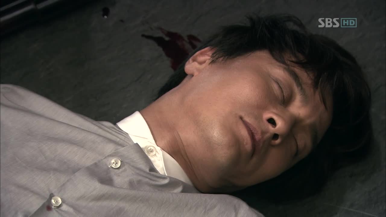 Yeong-rang paces the hallway outside the emergency room wondering why the pajamas were switched. So God needs to just save In-ha; if everything that happened to him was because she was too greedy, just let her die so In-ha can live. As she starts beating her chest in anguish, Secretary Oh runs up and tells her that the President has just passed away. Yeong-rang asks “who?” but turns towards the wall again… and sees all the blood still on her hand from cradling her (now-dead) husband’s head. It’s off to the restroom time, where she washes her hands clean and THEN sees Man-se’s blood all over her blouse. Ripping that off in the bathroom stall, she panics by taking it off and wrapping it up in a whole roll of toilet paper before throwing it in a trash bin. (Mark my words; that will come back to haunt her later.)