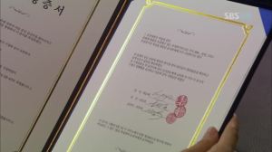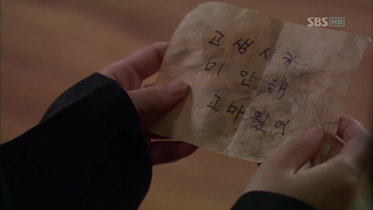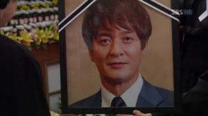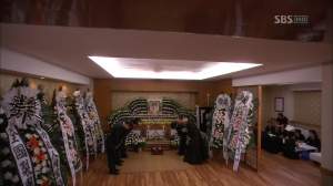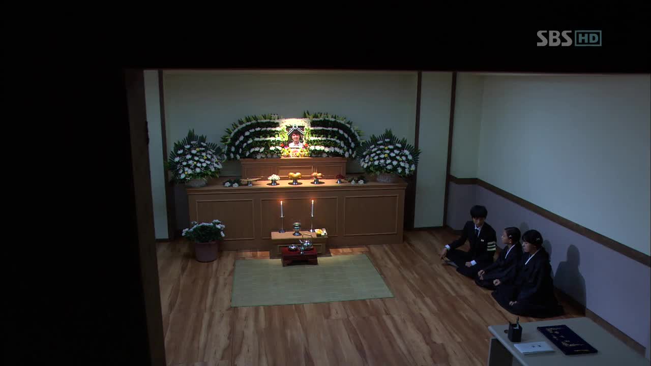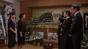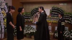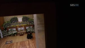 Looks like Dueling Funerals, as we see the Hong Family gathered for Soo-pyo’s service. Woo-jin asks his mother if she’s talked to the police. She nods and says that they found their appa underneath a collapsed pillar, and doesn’t know why he went up to the President’s house — it’s not like he knew them or anything. Woo-jin tells her that he probably ran up there to help, because that’s just the kind of guy he is. A nurse comes in and asks if they are the Hong Soo Pyo family, and that she has a note to give them. Soo-pyo apparently wrote it in the emergency room because he thought he may not see his family again.