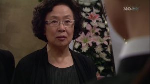 And in stark contrast to the spartan funeral of Deaf Dad, we see Yeong-rang and Ji-ho receiving mourners at Man-se’s funeral. Secretary Oh and Dong-yi bring up CrazyGran to allegedly pay her respects. Of course, the first thing she does is tear into Ji-ho for being an ugly boy for crying. If his father saw him like that, he’d rip Ji-ho a new one! CrazyGran, being off in LaLa Land, scolds them for coming to see flowers instead of getting President Yoo’s dinner ready for when he returns from his business trip. Yeong-rang tells Secretary Oh to stop letting mourners come in from now on…