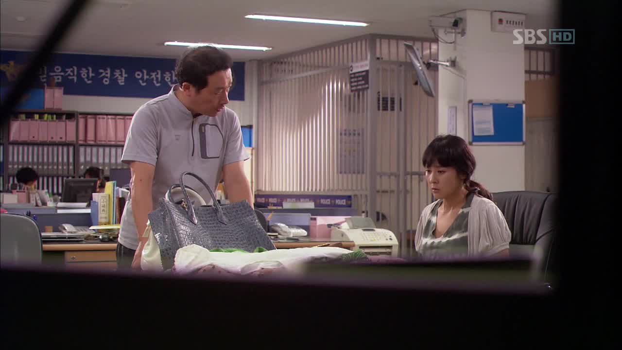 Nam-joo has been taken in for questioning by Detective Guy, and gets the Third Degree from him whether she knows or not how much this stuff costs? The one alligator bag alone costs over $10,000, so why is someone paying $300.00 a month in rent afford stuff like this? Nam-joo says that they didn’t buy it; a grandmother they know picked all this stuff up and gave it to them. Detective Guy tells her to quit playing him — these are all stolen items from President Yoo’s house! You took advantage of them knowing that their halmoni was suffering from dementia, right?