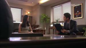 Throwing a bag of evidence down in front of her, Detective Guy tells her that this evidence was found in the debris under President Yoo’s desk — a torn-up will and a woman’s hairpin. (And again, I call NO WAY those items could have survived such a conflagration of epic proportions!!) She looks up at him dumbfounded, as Detective Guy tells her to look at it closely. It’s definitely an original, notarized will; they cannot figure out the content just yet, but it’s evidence that Man-se had a quarrel with someone over the contents of the will.