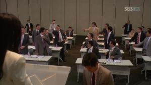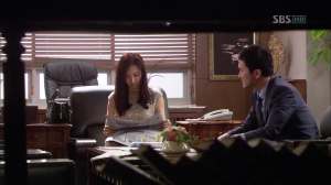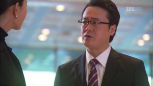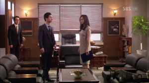 Attorney Choi purses his lips (not a pretty sight, ew) and says it won’t be easy since the Board wants to hire a management specialist right away, so things have already been decided. Yeong-rang turns on the charm (such as she can) and says that she can get Attorney Choi either money or a higher position in the company. He thinks about it for a nano-second, and then asks if he’s being too greedy if he asks for BOTH? (Ha. Spoken like a true lawyer.) Attorney Choi says okay fine… he wants 15% of the stock and the position of Vice President. Attorney Choi stands there just smirking at her until Yeong-rang says okay fine herself. She’ll promise him his demands and they stand in a Staring Contest, until Secretary Oh barges in and tells her that she needs to come down to the lobby pronto.