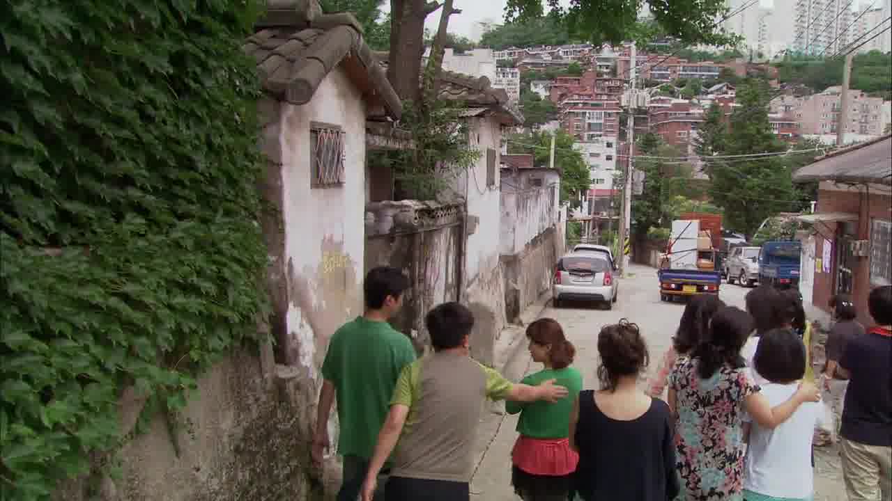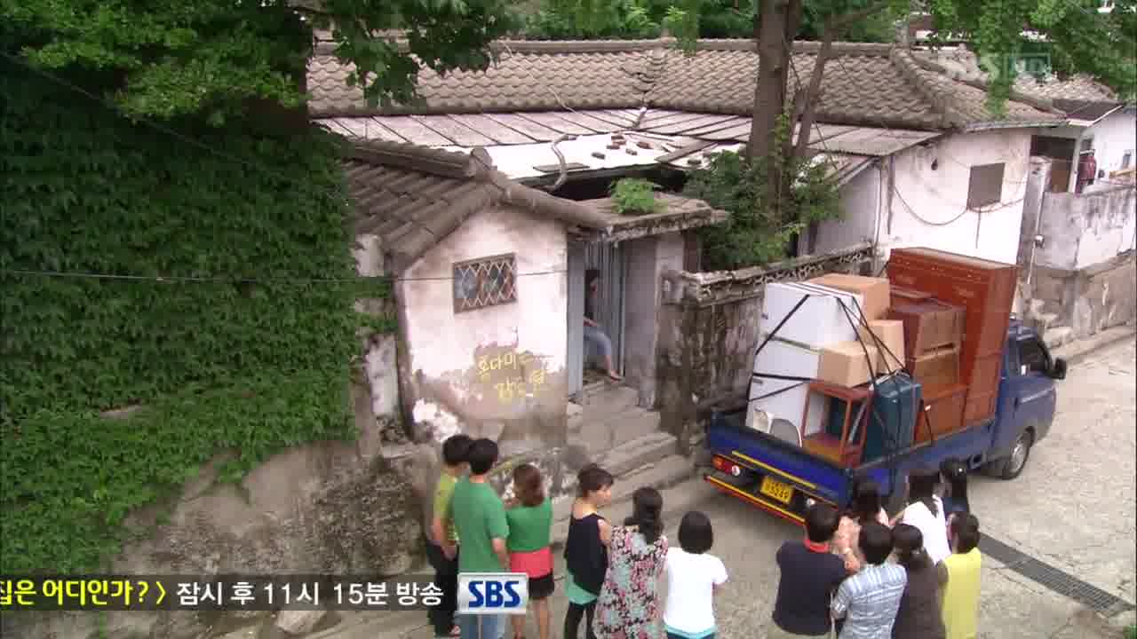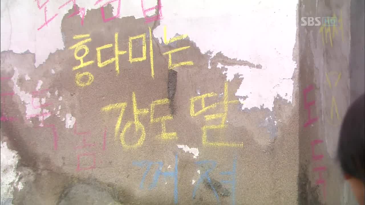 Back at the Hong’s neighborhood, a flatbed is parked out front loaded with their possessions while their neighborhood do-nothings all crowd around to watch. Nam-joo and Da-mi come out with more items to put on the truck, when she sees that someone decided to tag the place, saying “Hong Da Mi’s Father is a Thief.” Nam-joo loses it, and grabs a cloth to scrub off the graffiti. Da-mi joins her with her own cloth in an attempt to clean off the front of the house.