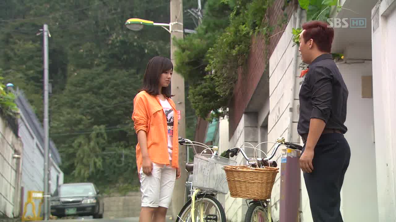Outside the restaurant, Louis and Da-mi are staring at the Girly Bike, totally astonished that it was (1) returned, and (b) that it came back in better condition that when he lent it to Da-mi. She mutters sotto voce that ‘he doesn’t seem like that type of person,’ as Louis asks if she might know the person that fixed his bicycle? Repeating what she just said, Louis gets all flustered and wonders if ‘that person’ may come back and ask him for the repair money… so lie and say that he shouldn’t have fixed it in the first place! Da-mi just blankly stares at him and says she doesn’t want to get involved with him again at all costs, but Louis says she needs to return this bike STAT. Da-mi uses that as an excuse to ask if she was truly fired, as Louis puts the blame on Headquarters confirming it’s a done deal. Saying she should just focus on her piano studies, he hops on to the Girly Bike and rides off down the hill.