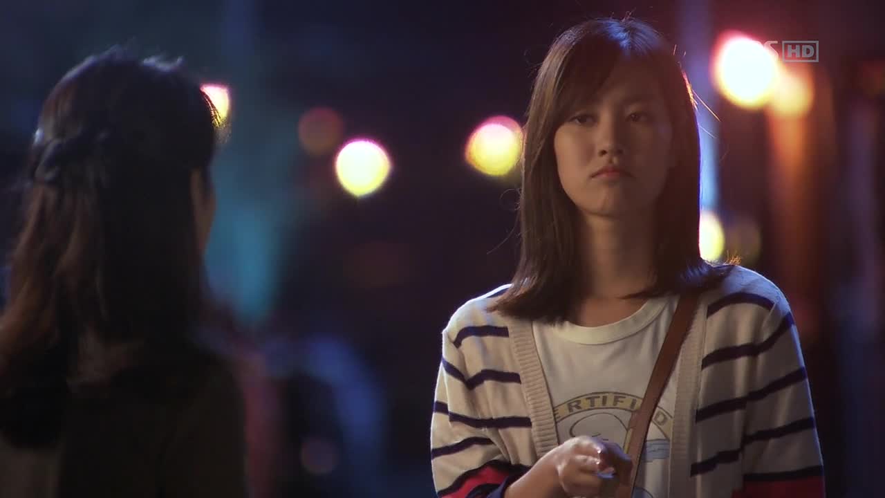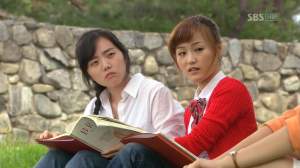 Snippy Student #1 asks Da-mi if she’s a student there, to which she says she isn’t; she’s there to meet someone. Snippy Student #2 says that if she’s not a student, she shouldn’t be butting into their conversation since only students are allowed onto the grounds! Da-mi apologizes for actually knowing what she’s talking about, as Ji-ho watches from a distance. He flashes back to their meeting at the Snooty Restaurant, where he accused her of being a fake graduate. Ji-ho calls out to her, thanks her for returning his bicycle because he knows how busy she is, and asks that hopefully she didn’t wait long for him. As the Snippy Students look on in horror, Ji-ho puts his arm around her and tells them she’s like a sister to him, so he’s really sorry for letting ‘just anyone’ into this expensive school that both the Snippy Students pay good money for. Suitably chastized, they scurry off with apologies towards their sunbaenim. Ji-ho turns to Da-mi and asks her if she wants to eat with him; he has a dinner appointment with Professor Ha.