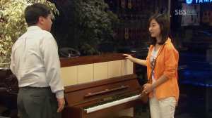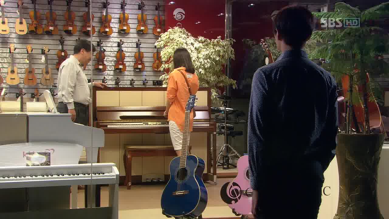 Later that evening, Ji-ho is driving Da-mi to her house… or so he thinks, saying that Ji-ho must be a tired little puppy and she can be let out in front of a music store instead. He reminds her that her first lesson is at 2:00 PM tomorrow, so don’t be late. Reaching around to back up the car, he sees a bag in the backseat that contains Da-mi’s textbooks. But instead of her hiking up the hill towards home, she ducks into the music store to ogle over another kinda butt-ugly piano. She chats up the manager to find out if no one has made an offer on that piano yet, because he promised to only sell it to her. The Store Manager says that they cannot guarantee it; it’s first-come, first-served with their store.