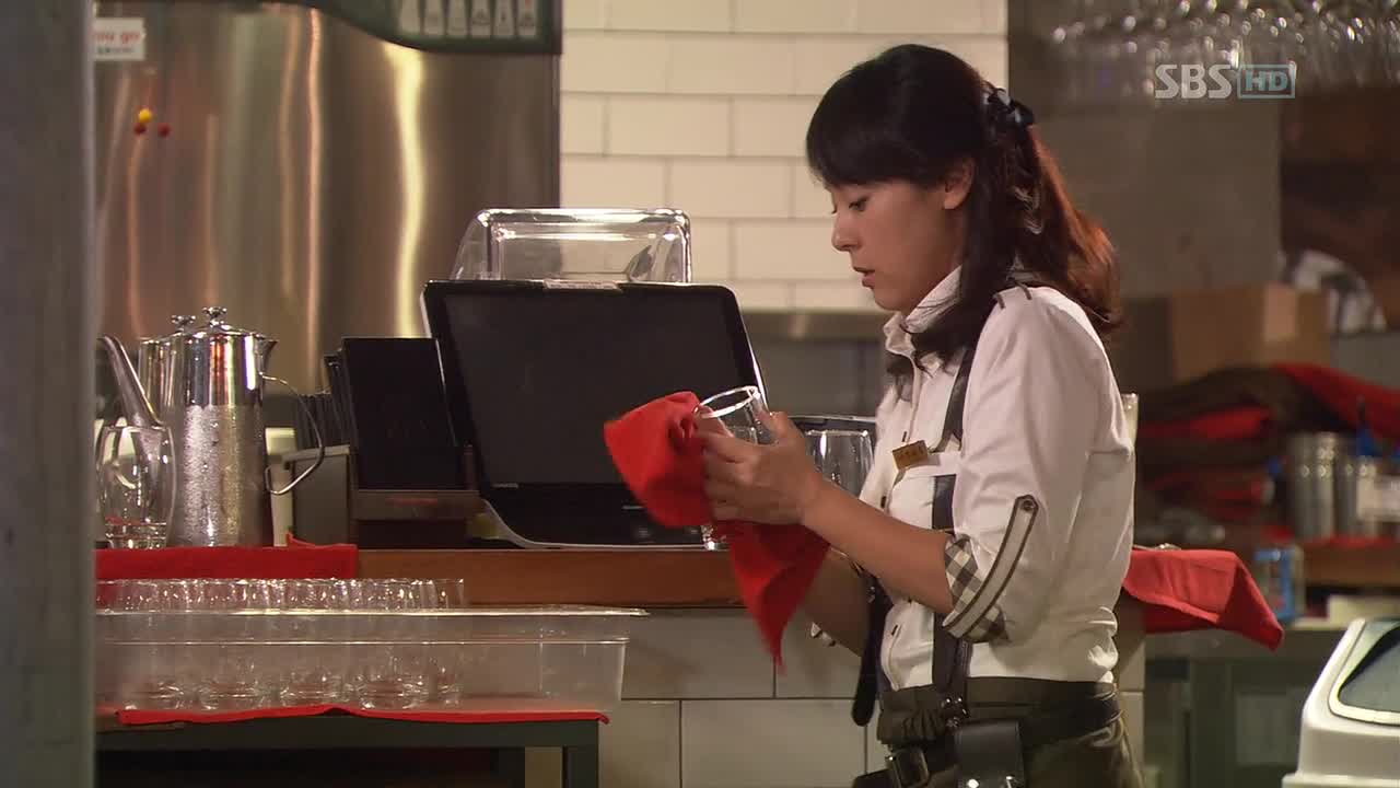 Back at the restaurant, Nam-joo is hustling butt to serve and greet and cook, while Louis, Bitchy Manager Girl and Do-ri all sit back and watch her in amazement. Louis wonders why Da-mi didn’t tell her that her mother was Wonder Woman when it comes to working like that, as Do-ri agrees saying that’s where Da-mi gained her impressive work ethics as well. Bitchy Manager Girl further solidifies her nickname by saying it’s distracting seeing Nam-joo do all that work at once; for god’s sake, look at how old she is!! Louis brushes that off, saying that she is way better than any younger employee by far — her nursing home food preparation experience must have taught her kindness and patience. Bitchy Manager Girl wonders if Louis is going to hire her permanently after all that, as Louis backs down a tad and says he won’t if Bitchy Manager Girl doesn’t like her — uncomfortably stammering that he wants all his employees to get along. Seeing a customer enter, he jumps up to greet them (obviously relieved to be not part of that conversation anymore). Bitchy Manager Girl continues crabbing that by Nam-joo showing that she’s an all-around team player, that’s proof positive that she wants to take over Bitchy Manager Girl’s position. With a look of contempt on that Botox-ed face, she orders Nam-joo to go take out the trash.