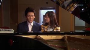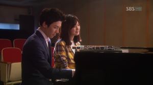 Da-mi asks why they’re in one of the practice rooms, as In-ha says he wants to play the piano and reminds her that he started liking here when she played the piano at the Snooty Restaurant. Da-mi tells him to stop joking around at her beginner status; she’s not all that and a bag of chips yet. In-ha tells her yet again that he is more than interested in her, and then drags her over to the baby grand (elephant) in the room. Sitting her down at the bench, he proclaims there’s something he’s always wanted to play with her. In-ha plinks out the first notes to “Heart and Soul,” as the realization slowly dawns on Da-mi.