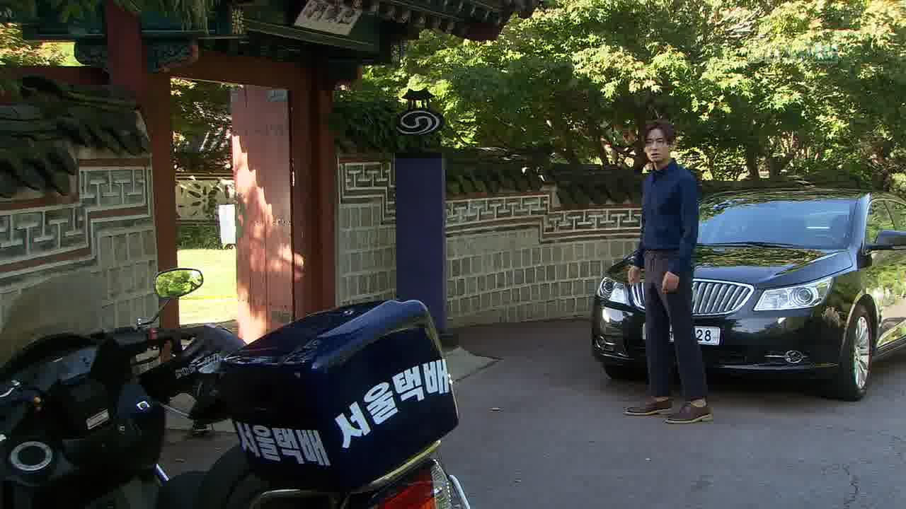 What we didn’t see from the end of Episode 7 is Ji-ho’s eyes shifting over to a pair of strange shoes next to the pair of designer heels. Repeating the shaky hand slowly opening the shoji, Ji-ho sees his mom with another person — Professor Ha! As they eyeball each other suspiciously, the Bad Delivery Guy sneaks out the back door with his suitcase full of loot. The ruse works, as Yeong-rang is pleading with the Professor to save Ji-ho and at least drop the charges. The Professor gets up in a snit and tells her he didn’t come here to talk about Ji-ho, remember? Asking how Ji-ho even knew she was there, she blames Secretary Oh for leaking the word of her ‘secret meeting’ with the Professor. Ji-ho suddenly remembers the delivery scooter and scoots out himself, as Yeong-rang tells Secretary Oh to tail him.