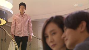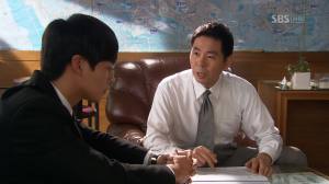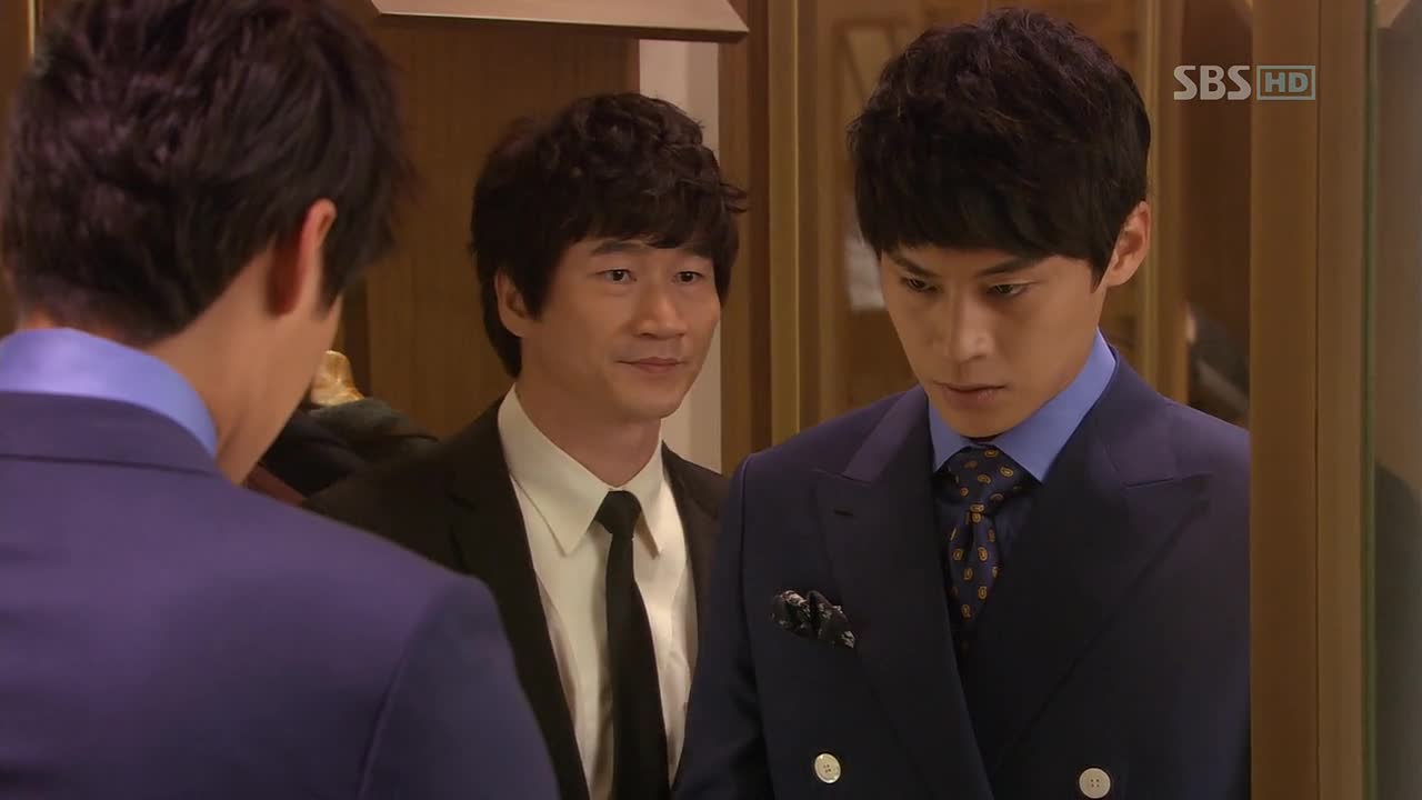 … before sitting down with Assistant Guy to discuss Woo-jin’s progress, saying he’s going to have a great future at Geumdan if he continues like that. Asking Assistant Guy how much more he’s found out on Woo-jin, he tells Jung-wook that it’s true Woo-jin dropped out of medical school, and his father died in an accident several years ago. He has a mother and a younger sister, and they’ve gone through some great financial difficulties since his father’s death. Jung-wook asks what type of accident did Woo-jin’s father die in, as Assistant Guy says all he knows is that it was a fire… should he find out more? Jung-wook poo-poohs that idea, because he’s sure they’ll find out more soon enough. But go play Fashion Police with Woo-jin, because his image needs to be upgraded if he’s gonna play with the Big Boys at Geumdan Construction.