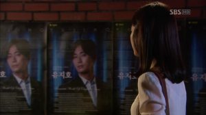 Riding the bus home, Da-mi attempts to call Ji-ho but he’s not picking up. She flashes back to the events earlier in the evening about Ji-ho’s raking over the coals by his family. Walking by the Hanguk music school, she doesn’t see his bicycle chained up out front as normal, and yet another flashback to their first not-cute-meeting after the accident on the bike trail. More flashbacks to their bike ride later, their argument outside the piano store, drawing in the Girly Binder, them playing together during one of her lessons, yada yada yada. Steeling her resolve, Da-mi heads around the building only to be confronted by a brick wall full of Yoo Ji Ho posters from his upcoming-but-now-cancelled concert. Asking where in the world Ji-ho has run off to, she questions whether or not he’s really her teacher ’cause he ain’t acting like one!