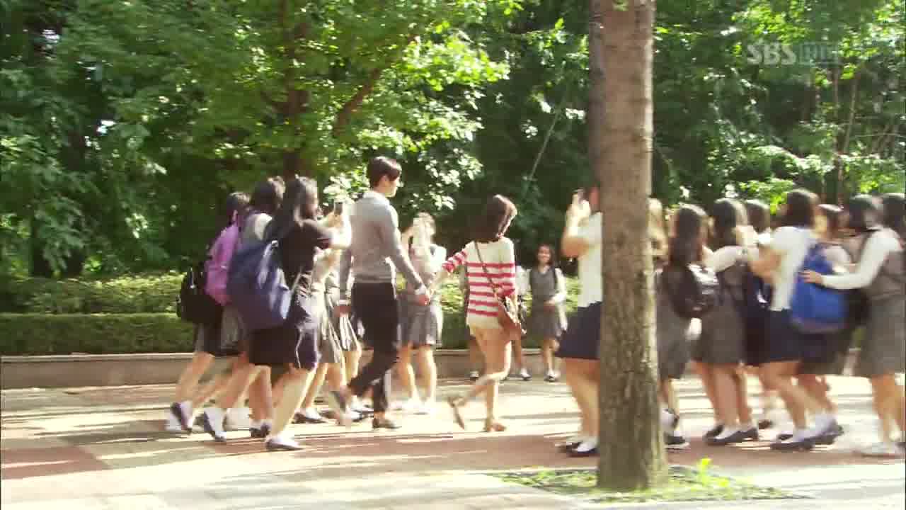 Ji-ho grabs her hand (*drink*) and drags her away from the forming crowd, saying that he’s not in disguise for himself; he doesn’t care. But why should Da-mi be painted with the same wide brush in embarrassment to be see with him? She reaches up and takes the hat and glasses off his face, and tells him she’s there to meet with her favorite pianist, Yoo Ji Ho. He shouldn’t have to hide from people just for her benefit; she wants him to hold his head up high in front of people! The look on his face could melt butter, as she gently takes his hand and says that they should go now. Together. They head off at a brisk pace, but suddenly a group of schoolgirls gather around, squeeing and taking lots of pictures until Da-mi and Ji-ho have to take off in a dead run to avoid being trampled by them. (Obviously these girls must never read the papers or live under a rock. Just sayin’.)