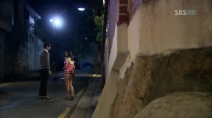 Just about this time, In-ha comes around the corner, searching the streetplates to find Da-mi’s house. He sees the two conversing outside her front door, and wraps his fist around the dolphin keychain in anger… anger that is rising so fast that In-ha can do is turn and walk away.