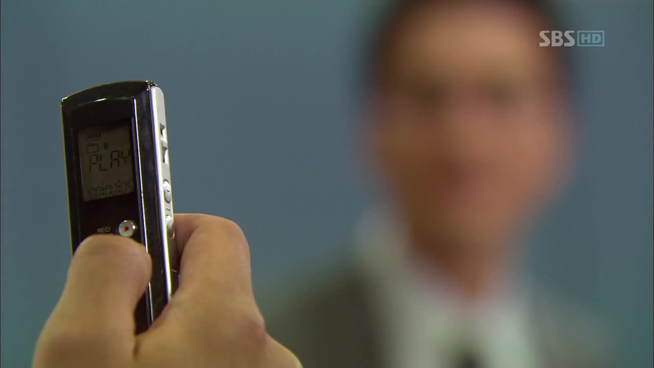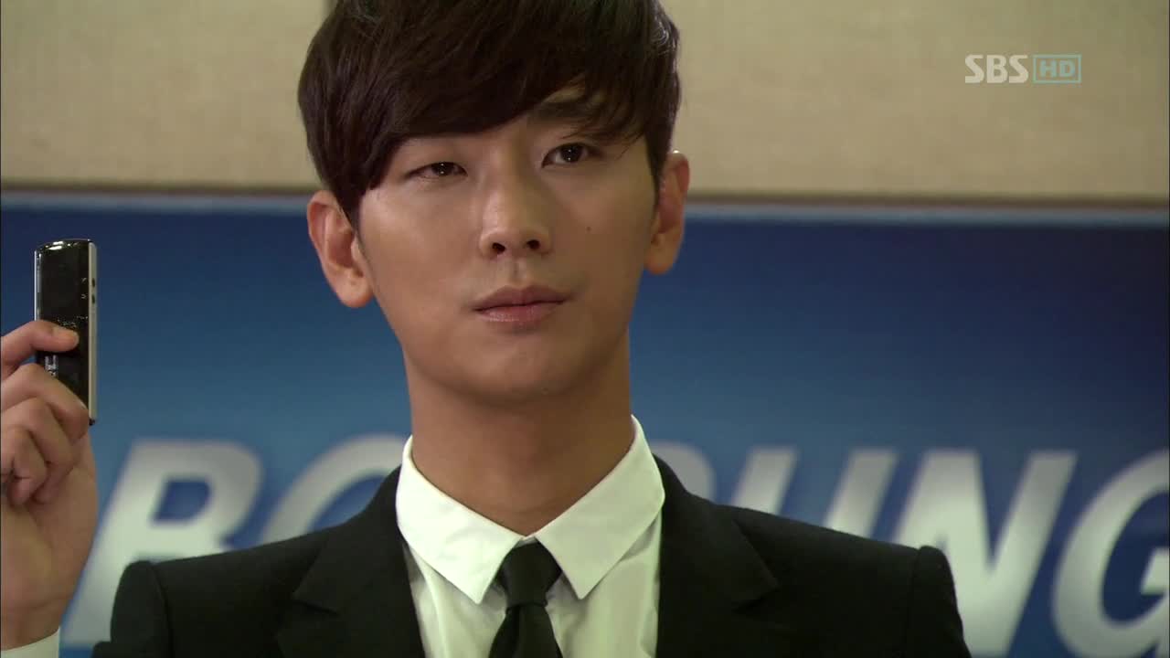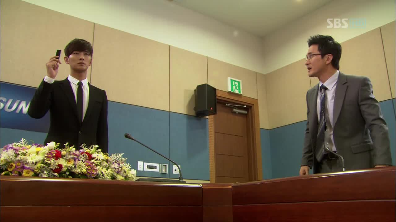 Now there’s the Joo Ji Hoon we all love and remember, dressed very nicely with Perfect Jihoon Prince Shin hair all in place. (Excuse me a second… *fans self*) Ji-ho says that as he’s the largest shareholder in Boosung, he’s gonna be handling the emergency Board meeting today. And because he’s doing that, he has an important announcement to make about the false rumours about him that have caused great harm to the Boosung Group’s image. But today, Ji-ho has received crucial evidence that someone was deliberately framing him. Ji-ho stands up, holds up the tape recorder that Professor Jang sent him, and says this is the evidence.
