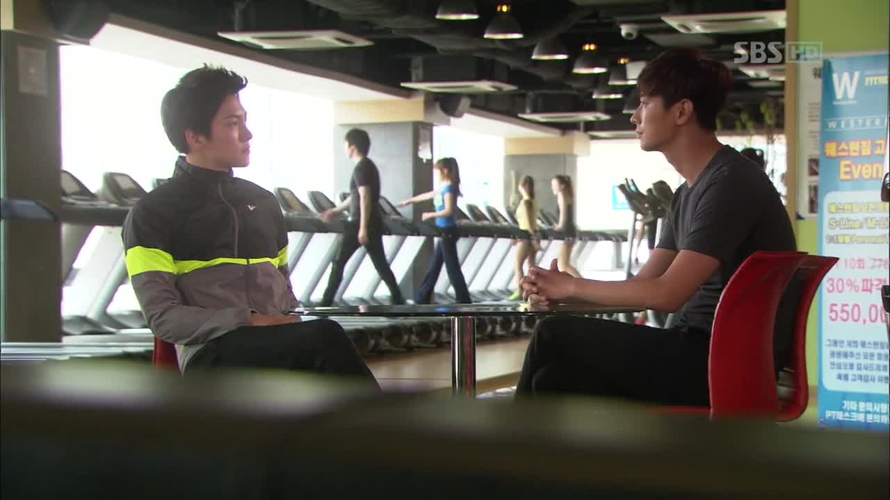 In Real Life Marathon Runner Ji Chang Wook… erm, In-ha is hitting the treadmill at the Boosung Fitness Center, when Ji-ho walks up and hands him a bottle of water. (And PD-nim, you can hide all the clothing labels, but we still know he’s wearing an Under Armour coverlet there.) Sitting down to chat, In-ha asks where Ji-ho scurried off to so early in the morning. Ji-ho said that he came to see In-ha; he knows that In-ha was up all night practicing, so how’s the demo progressing? In-ha says there’s no reason for him to fail… he’s working harder because Professor Ha has high hopes for him. Ji-ho tells him it will go well are high; he believes in his dongsaeng because he’s been acknowledged as the best composer. Ji-ho wonders if maybe he should start getting worried now? In-ha asks Ji-ho what it is exactly that he is going to do in the future? He’s quit college and it’s gonna take awhile before everyone believes that he’s not a traitor… won’t he get tired of composing in his room? Ji-ho tells him he’s going to go work at Boosung now, and only concentrate on the company for the time being. It’s time for Ji-ho to regain Appa’s spot in the company.