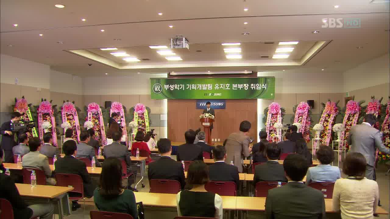 Ji-ho walks up the steps of the Boosung offices, flanked on both sides by company toadies. At the top of the stairs await Yeong-rang and Attorney Choi — she smiles at him and he glares back; Attorney Choi nod-bows to him and he glares back even harder and heads off to his office. As soon as he’s out of sight, she drops the pretense and sighs. Rice wreaths at the ready and the press conference announcing his appointment as R&D Director in full swing, Ji-ho tells the crowd that it was because of his father Yoo Man Se’s passion for music that made him put his all into forming Boosung, and now it is a world-reknowned company because of that. But the next incident that causes any blemish to its reputation, he will not forgive the transgressor… but looking over at Yeong-rang and Attorney Choi in the front row, Ji-ho has decided to forget all about the troubles that occurred prior to his assuming the R&D Director position. Once… just once.