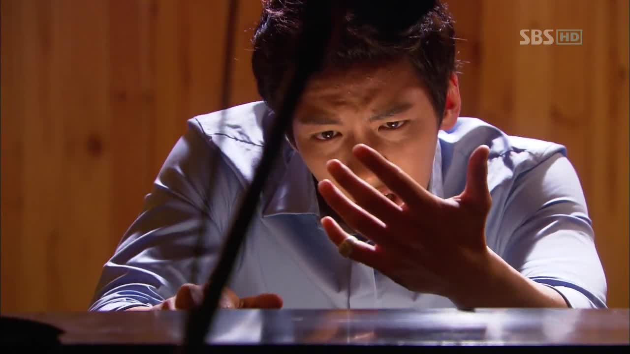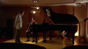 At the recording studio, Professor Ha tells In-ha that he listened to his demo CD and In-ha asks if it’s been sent it off to the Music Committee yet. The Professor tells him he should do that now, but before he does, he’d really like In-ha to play it live for him right now. Pulling up the bench, In-ha jumps into the first movement until Professor Ha slams his hand down on the keyboard and orders him to STOP!! In-ha looks at him with a WTF? on his face, as the Professor demands to know if this is a joke (while holding out the CD in its case). Did In-ha think the Professor was that naive to believe that In-ha was the pianist on that disk? In-ha flashes back to earlier when he couldn’t get through the piece without severe pain, and then to an In-ha look-alike playing his composition (after being handed the White Bribe Envelope by In-ha, of course)
