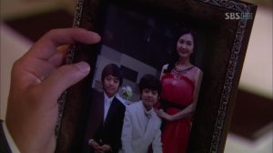 Ji-ho returns home that evening and picks up the picture of he, In-ha and Yeong-rang sitting on the sideboard (Man-se being so obviously cut out of it). Giving it a good long stare and then putting it back down, he heads upstairs… as we see Yeong-rang hiding around the corner possibly having a bit of a conscience crisis at that time.