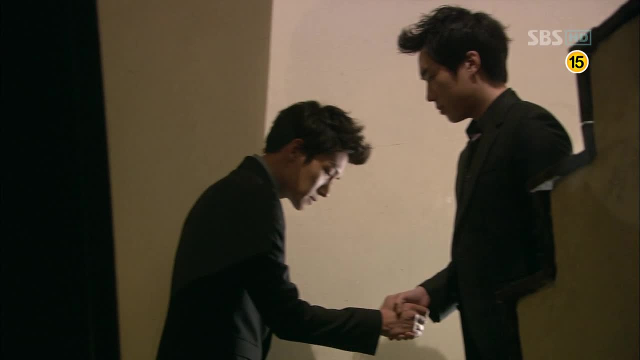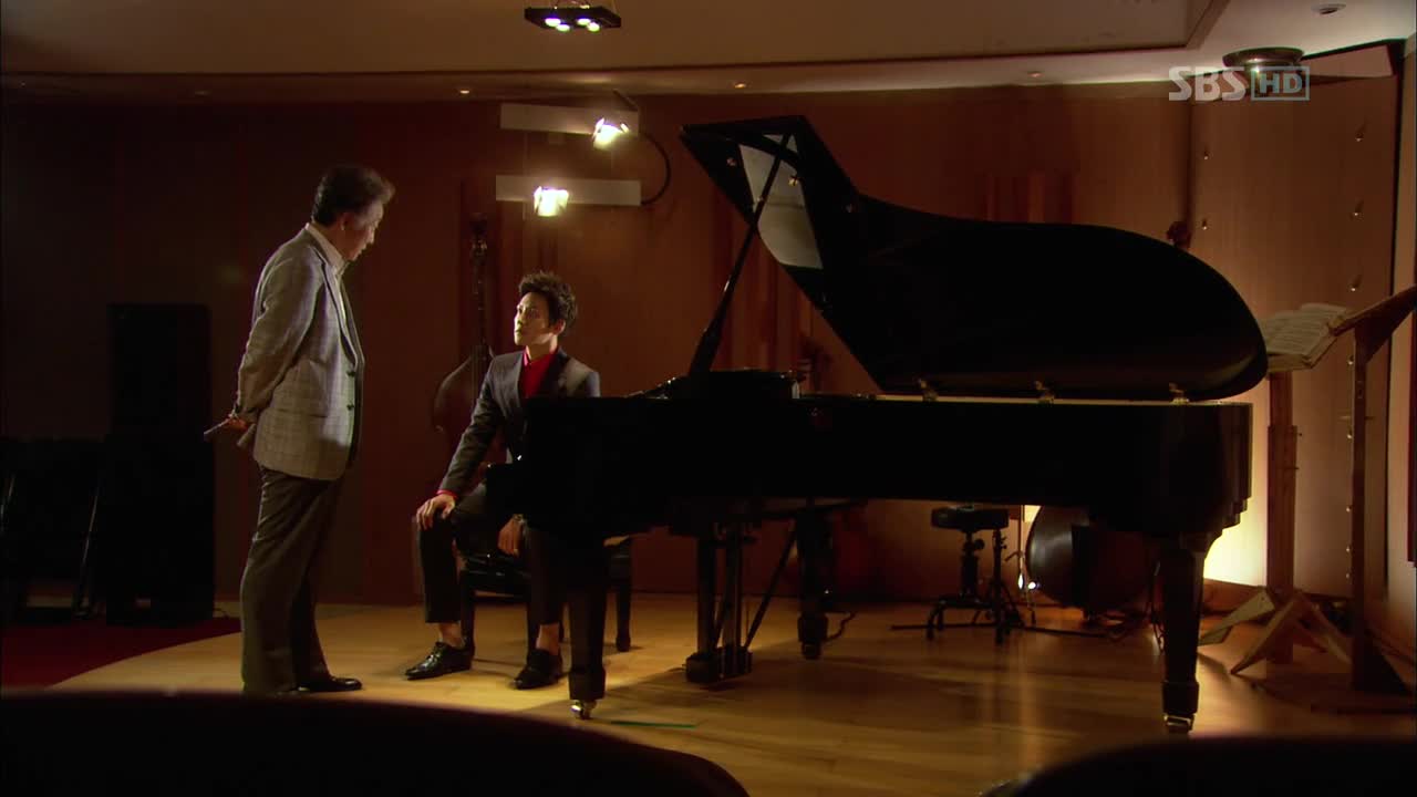 In-ha drops to his knees to beg for mercy. He apologizes because his fingers were overtaxed because of all the practicing he did for the Charity Concert. It is a song that they need to send overseas, and In-ha didn’t want to sully the Professor’s reputation… the Professor cuts him off, asking if it made more sense to hire a stand-in pianist because he was worried about the Professor’s honour?!? The main reason he made In-ha the successor was because of that dead little finger that was silently helping his other fingers — the unique harmony made by In-ha’s left hand was his strength!! It’s all In-ha can do except apologize over and over; it was wrong of him to do what he did, so could he give him just one more chance? The Professor snorts and says give someone who fakes music another chance? He must have been out of his mind when he made In-ha his successor… he’s going to null and void that decision RIGHT NOW!! In-ha grabs on to the Professor’s arm for dear life (*drink*), and pleads for him to think about not nullifying his decision, because if he does, then the Professor’s reputation will go to hell in a handbasket. Professor Ha says that he’ll take that chance, instead of having a rotten musician in his stead. In-ha is left to beat the stage with his fist.