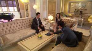 And there he is at Boosung HQ, meeting with Yeong-rang and Attorney Choi. He hands his card over to her, as she asks if he’s even Korean. Woo-jin says that if she’s curious, go ahead and check him out if she wants; his personal information should already be sitting in her secretary’s office. Yeong-rang tells him it’s quite interesting to see such a young executive being sent over on such an important business transaction. Does Geumdan not think highly of Boosung, as Woo-jin counters and says that isn’t the case… their company is putting all in on this purported deal. That’s why he’s there, not to sell the Incheon land to Boosung, but to propose a joint venture with them instead. Yeong-rang wonders if Geumdan is having trouble with the deal, but Woo-jin dangles the bait that the project Boosung proposes is impossible for them to handle alone. For one thing, they’re going to have trouble with relocating the current residents.