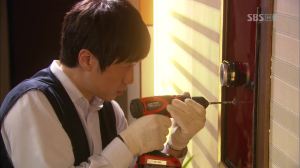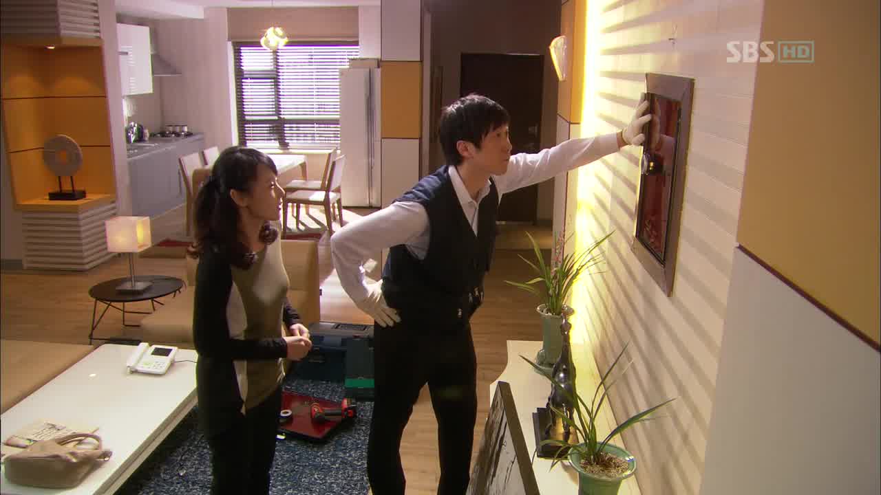 Nam-joo takes the restaurant trash to the curb while thinking that the tape recorder with all the incriminating evidence must be in Attorney Choi’s safe. But how does she get into it not knowing the combination? Pulling out her phone, she calls Saejin Locksmiths for some advice. (Why she has a safe-cracker in her speed dial boggles my mind.) We see the locksmith examining said safe, as Nam-joo tells him she’s been very forgetful and doesn’t remember the combination; can it still be opened? Locksmith Guy says it will be quite difficult because it’s a custom installation, but that doesn’t deter Nam-joo because she’s willing to pay him whatever it takes to open it. Locksmith Guy says that if she doesn’t mind it getting ruined in the process, he can drill into it instead. Which he does, as Nam-joo nervously watches the front door for signs of Attorney Choi.