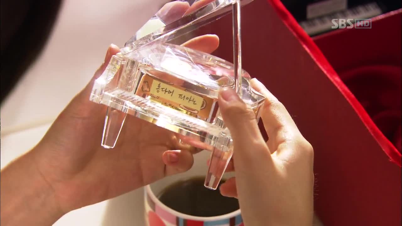 Louis rushes into the restaurant with a package for Da-mi that was just couriered over. Da-mi feigns nonchalantness, as Do-ri orders her to open it. Could it be from her regular customer who has a crush on her? Bitchy Manager Girl calls no way, but Da-mi opens the box anyway. Inside are four perfect miniature pianos… with no note, so Da-mi doesn’t know who sent these to her… AT FIRST. The crystal miniature sports a tag that says “Hong Da Mi’s Piano,” as she flashes back to the confrontation with Ji-ho at the music store. Bitchy Manager Girl says whomever sent these to her instead of bringing them by personally must be a big showoff. (Ha. Jealous much?) Da-mi says that she doesn’t think he is showing off, but he is sure doing as he pleases! She winds up the crystal piano, and the same song that Da-mi played at the restaurant and got busted by Ji-ho for plays in the background…