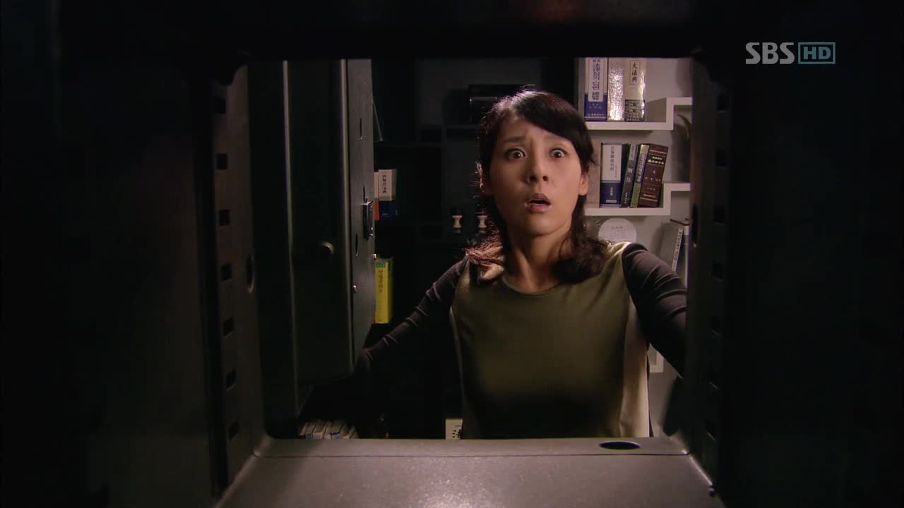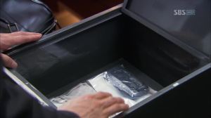 Back to the safecracking! Locksmith Guy has finished his drilling and tells Nam-joo she can open it now. (Like that big hole is not going to be noticeable at all.) She does that and is gobsmacked to see that the safe is empty!! (Excuse me while I roll on the floor laughing…) She voicesover that something has gone wrong… as Attorney Choi visits the safe deposit box at his local bank to further hide the tape recorder and bloody blouse.