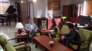 Professor Ha is reviewing several scores in advance of the UN Peace concert, when So-yeol rushes in and tells him the news of Attorney Choi’s blackmailing of Ji-ho and bribing Professor Jang as well. Slowly raising his head at this news, So-yeol continues that it was probably Attorney Choi who stole his unfinished composition and blamed Ji-ho on it. She swears on a stack of bibles! Professor Ha kinda calls no way on all that news, but So-yeol says that it’s because he wanted to turn Ji-ho into such a laughing stock to drive him out! Professor Ha wonders even if that news was true, how can someone do that to someone else? So-yeol goes in for the kill, and tells him that Professor Jang confessed everything and gave Ji-ho a tape recorder with all the evidence that Oppa played at the Board of Directors Meeting!