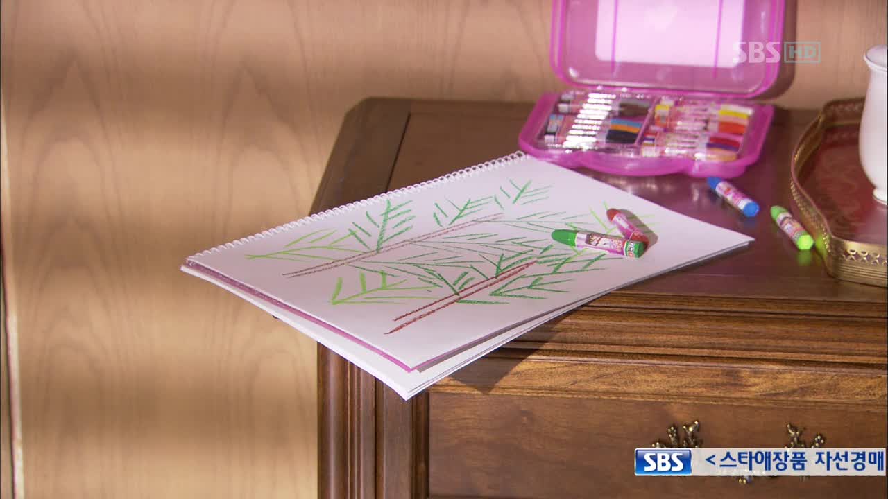 As promised and/or threatened, Yeong-rang is visiting CrazyGran at Nursing Home #3.  The nurse ahjumma comes in and tells her she won’t be able to visit properly today because her mother-in-law’s condition is not good today and she’s getting intensive treatment right now.  (Whatever that means.)  Well apparently she’s been having seizures and not eating well, so that must mean she’s in decline.  Yeong-rang, being the compassionate person that she is, says oh well, we can’t do anything about that… so byeeeee!  But on he way out, she notices a sketchpad on CrazyGran’s night stand.  Picking it up, she sees that a bunch of trees were drawn on it, as the nurse ahjumma says CrazyGran called them spruce trees.  Yeong-rang asks if anyone else has seen this, and the nurse ahjumma says her oldest grandson has been by to visit… he always comes on his days off every week, taking her on drives and walks and everything.  Yeong-rang mutters that Ji-ho must made the first move himself.  Because she doesn’t want to break a nail doing it herself, she orders Secretary Oh to search CrazyGran’s room for anything piano-related.  So while he’s tearing up things, she voices over that she needs to find the manufacturing notes first so she can keep Boosung’s control.