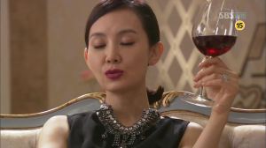 Lounging in a chair savoring her latest victory over Yoo Ji Ho, Young-rang enjoys a glass of wine while the the Dies Irae from Verdi’s “Requiem” plays in the background. In-ha barges in to ask if she’s heard the latest on Ji-ho, but she silences him with a single SHHHHH.